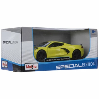 Make the perfect addition to your home hobby vehicle display using this Special Edition Corvette Die Cast Car! This neon yellow 2020 Chevrolet Corvette Stingray Coupe Z51 is made from die cast metal with plastic parts. The car has opening parts, detailed rolling wheels, and various custom features for a unique look. Display it in or out of its packaging for a remarkable look on a shelf or in your garage!