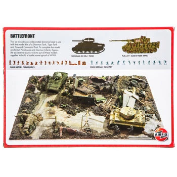Set-up a wonderful recreation of a famous day in history with D-Day Battlefront Diorama Kit. This set includes an undecorated diorama base to use with the model kits of a Sherman Tank, Tiger Tank, and Forward Command Post. To complete the model are British Paratroops and German Infantry figures. Be as creative as you wish to put all these models together to build a battle scene typical of WWII.