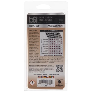 Cure all super glues in seconds with Insta-Set Accelerator! This accelerator liquid is compatible with all surfaces including plastics and foam and all Bob Smith Industries super glues and CA glues, so keep in nearby for all your model projects and crafts. Spray the seams with Insta-Setβ’ to cure it in as little as eight seconds. It also makes a great cleaning agent for adhesive residue and scuff marks!